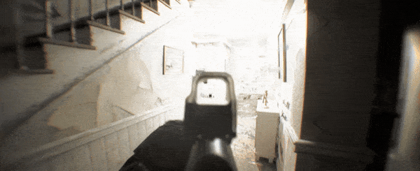 雖然遊戲本身還在EA狀態,但它目前在槍戰場景的還原上已經有模有樣,最直觀的感受就是遊戲對局內幾乎沒有任何UI,只有可拾取的武器和隊友才有個細細的綠框標註(順便一提這框真帥),並且在攝像頭的視角下從暗處走到光下會暫時過曝,麥克風收錄的槍聲震耳欲聾,轉動視角和移動有些拖泥帶水的感覺,每次主角移動或奔跑時畫面都會伴隨着或輕微或劇烈的抖動,這也是遊戲能在字面意義上讓玩家玩吐了的原因之一。