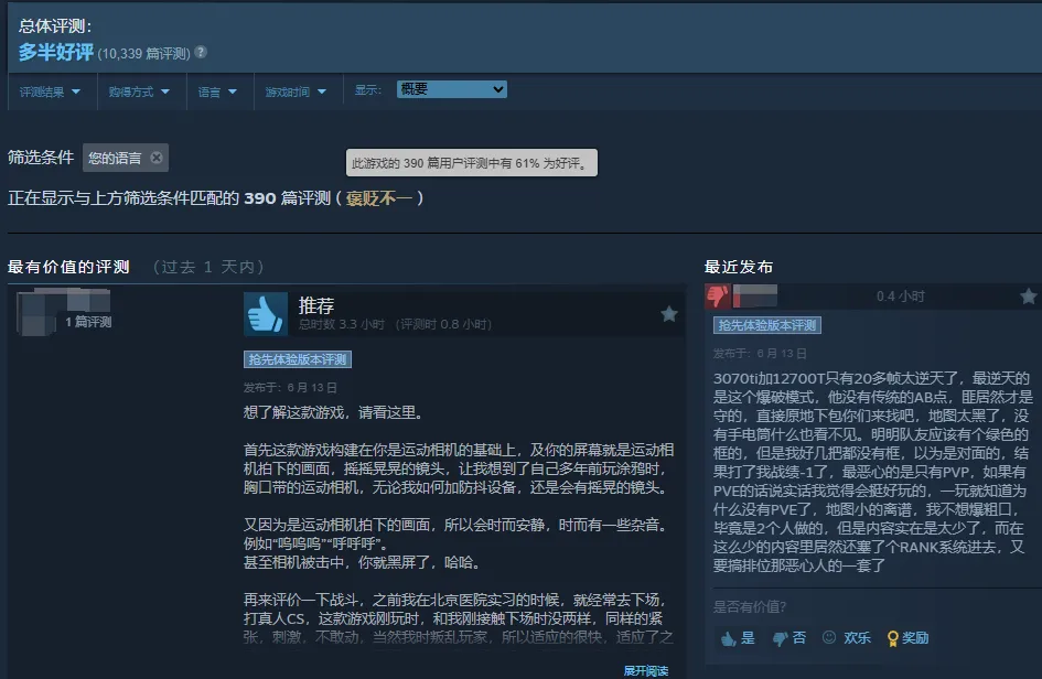 **高度擬真的操作加上殺得快死得快的遊戲節奏,可以想見這個組合並不容易被大眾接受,**因此剛一發售時玩家對遊戲的評價還只是褒貶不一,後來進行了幾次更新和修復後才逐漸漲到了如今的多半好評。