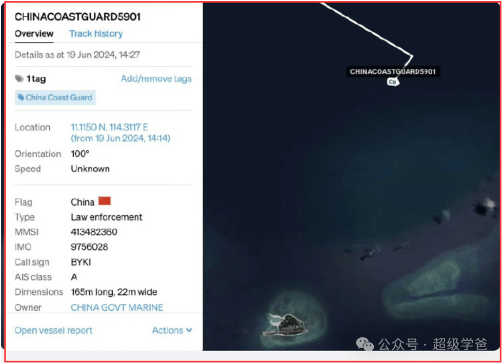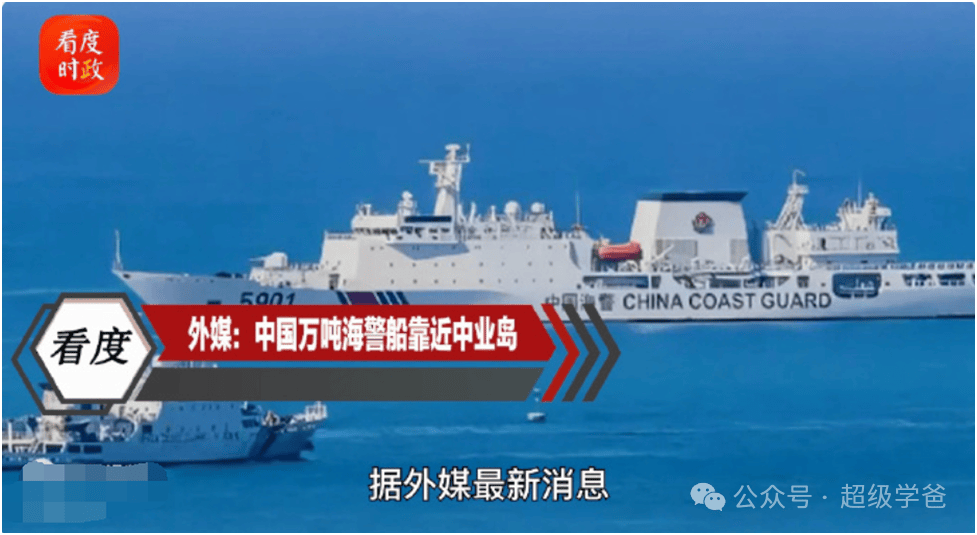 6月19日下午,中國一艘萬噸海警船(5901艦)昨抵達中國南沙羣島中業島附近。5901艦滿載排水量高達1.2萬噸,與055萬噸大驅相當。