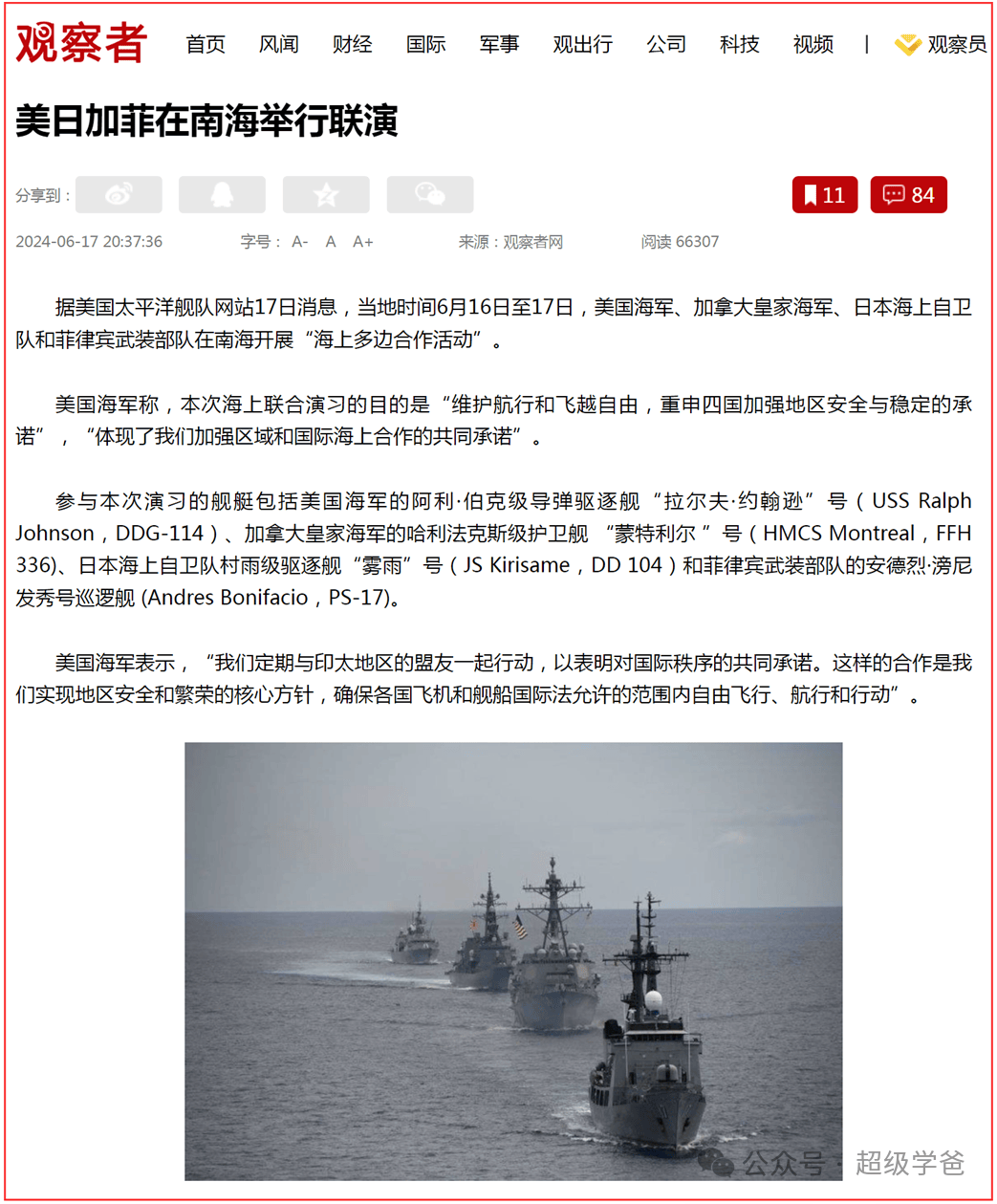中國修改海警新規,並於6月15日生效,簡直是卡着點給G8上眼藥,尤其是美國這個頭兒。這個眼藥更上頭的是,6月16~17日,美國、日本、加拿大和菲律賓在南海進行聯合演習。