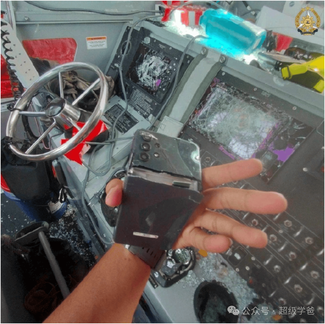 由於菲方人員開船技術不過硬,一名菲方士兵的手指被夾斷了。為了替這名菲方士兵出氣,徹底消除安全隱患,保護菲方人員的生命安全,我海警戰士對這害人的東西進行了破壞。