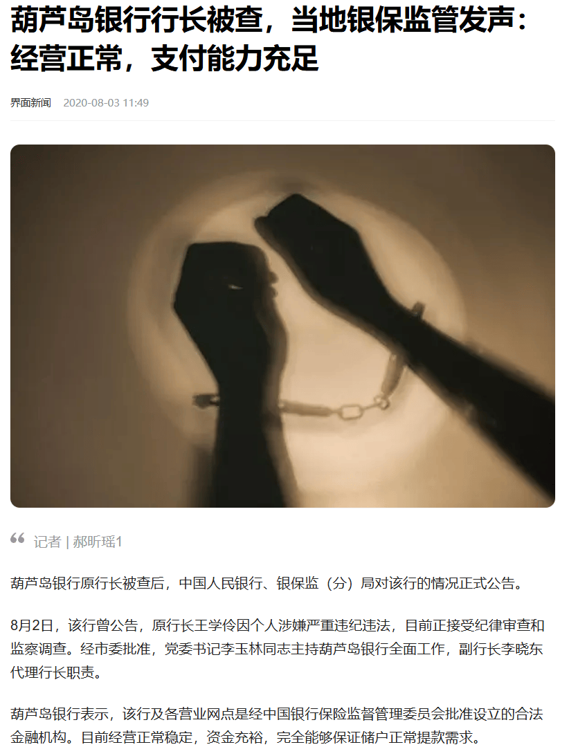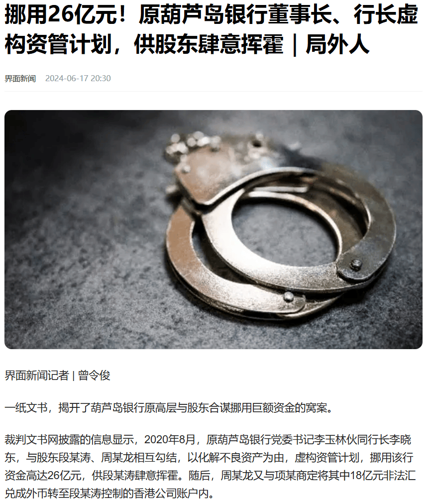 現在回過頭來看,葫蘆島銀行當時確實資金充裕,管理層還能合起夥來挪用26個億,供段老闆揮霍。