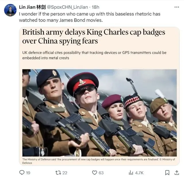 對此,我外交部發言人、外交部新聞司副司長林劍在社交媒體X上發表了評論。“我想知道提出這種毫無根據的言論的人,是不是看了太多的詹姆斯·邦德(《007》電影主角)電影。”