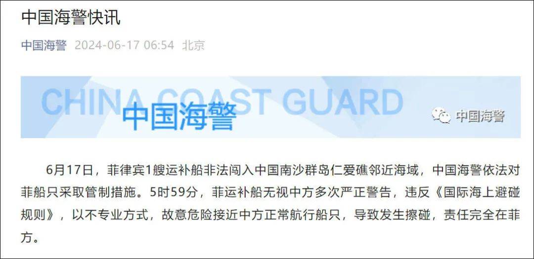 6月17日中國海警發了一個通告,説菲律賓1艘補給船非法闖入我國南沙羣島仁愛礁附近海域試圖為非法坐灘的破船補給時,以危險方式接近中方船隻導致碰擦,責任完全在菲方。