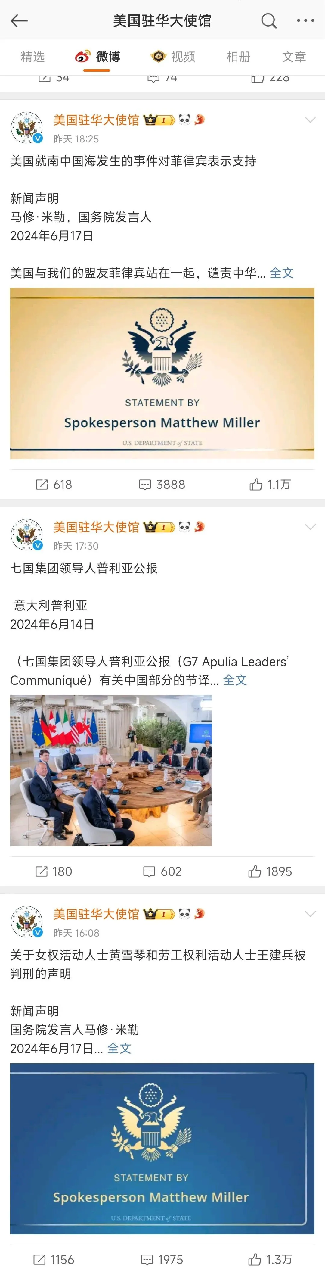 美國氣急敗壞,對此事反應強烈,給予了菲律賓最高程度的支持,其駐華大使館官方微博連續發了3條攻擊中國的微博,對中國表示了自己的強烈不滿,並對中國進行了口頭譴責。