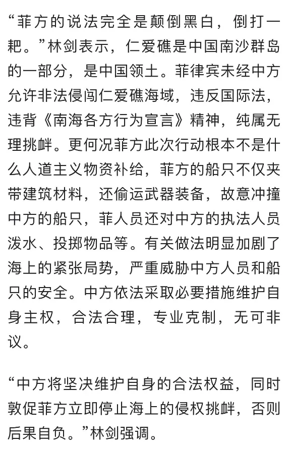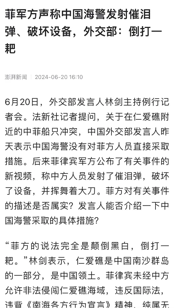 對於菲律賓官方的其他説法,比如發射催淚彈啊,砍碎駕駛艙和手機,奪取槍支等等指控,中國外交部發言人給出了官方回應,菲方説法完全是顛倒黑白,倒打一耙。