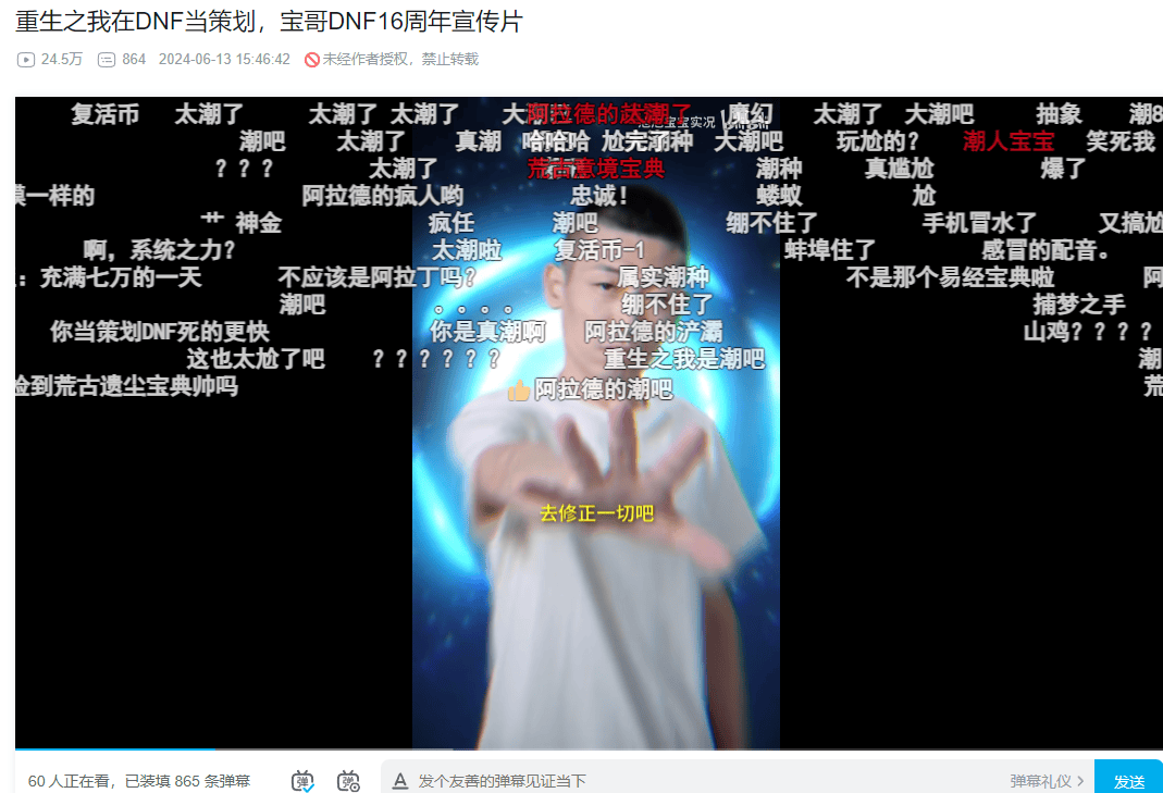 相比這些,更有趣的是短片的主演和發佈者,是被DNF玩家們譽為“八百萬勇士嘴替”的旭旭寶寶,且發佈的時間——6月13日,則正趕上DNF更新十六週年版本。