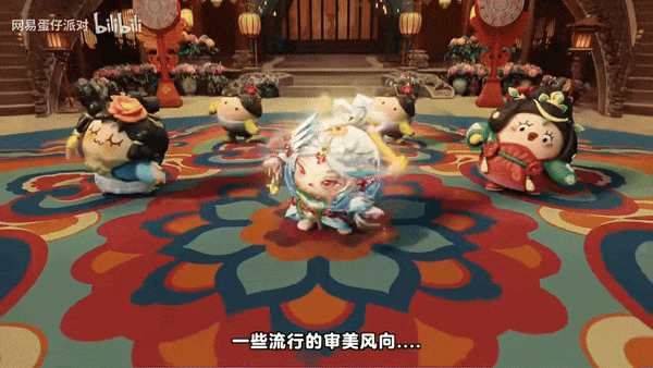就以舞會的首個環節“飛天遺夢”為例。這個環節靈感來源於此前官宣的龍門石窟聯動,整體使用了大量的傳統文化元素:石窟壁畫、九色神鹿、琵琶霓裳、瓊樓玉宇……在婉轉的樂曲聲中,飛天舞姬蓮若率先登場。她的整個造型都是參考龍門石窟壁畫中的舞姬形象而設計,與蛋仔圓滾滾的外形結合顯得憨態可掬。她的舞蹈動作並非是亦步亦趨地模仿真人舞蹈,而是充分利用蛋仔的造型優勢,使用大量的翻滾旋轉動作,藉助圍繞在周身的綵衣霞帔,將飛天舞姬的“仙氣”展現出來。