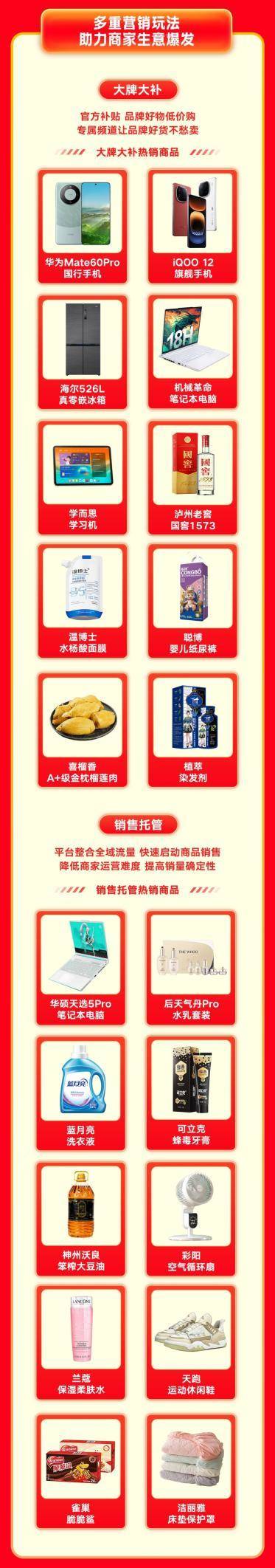 大促期間,平台通過“銷售託管”模式,成功打造華碩天選5Pro筆記本電腦、後天氣丹Pro水乳套裝、藍月亮洗衣液、可立克蜂毒牙膏、神州沃良笨榨大豆油、彩陽空氣循環扇、蘭蔻保濕柔膚水、天跑運動休閒鞋、雀巢脆脆鯊、潔麗雅牀墊保護罩等爆款產品。