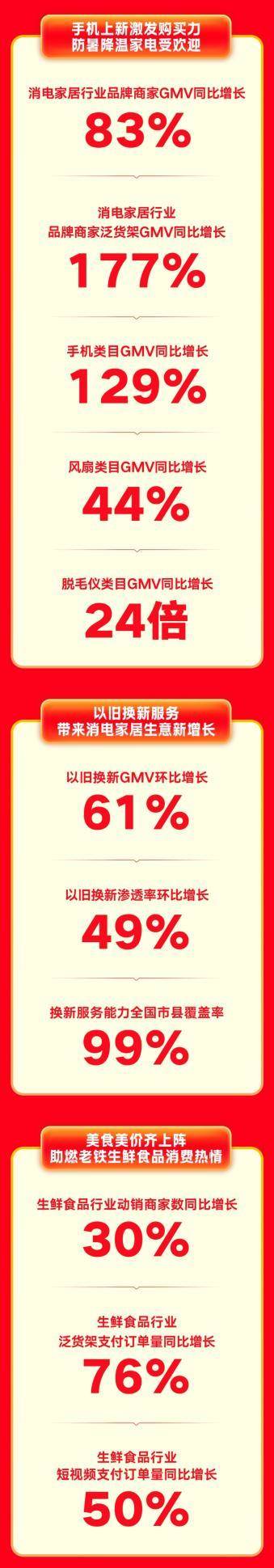 從熱銷品類看,防暑降温類家電在618期間增速明顯,其中風扇類目GMV同比增長44%,家電套裝類目GMV同比增長62%、脱毛儀類目GMV同比增長24倍。手機行業表現亮眼,手機類目GMV同比增長超129%,蘋果、榮耀、芝華仕等品牌表現突出。