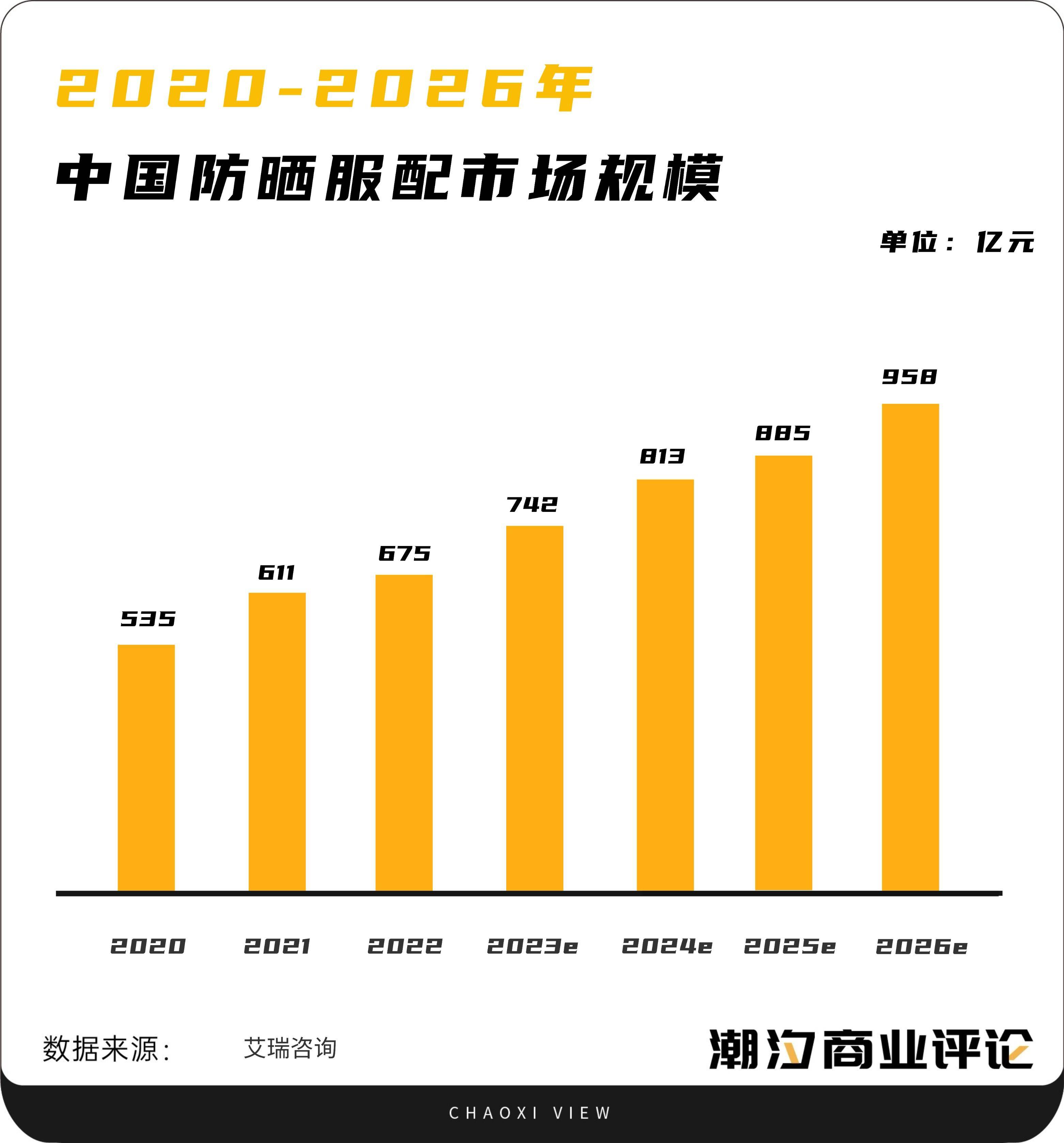 據《中國防曬衣行業市場全景調研與發展前景預測報告》顯示,從2021年至2026年,防曬服配的市場規模預計將以9.4%的年複合增長率增長,預計到2026年,我國防曬服配市場規模可達958億元。