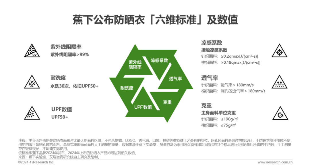 今年4月,行業首個標準《中國防曬衣行業標準白皮書》發佈,蕉下聯合艾瑞諮詢公佈了防曬衣六維標準和可量化參數。