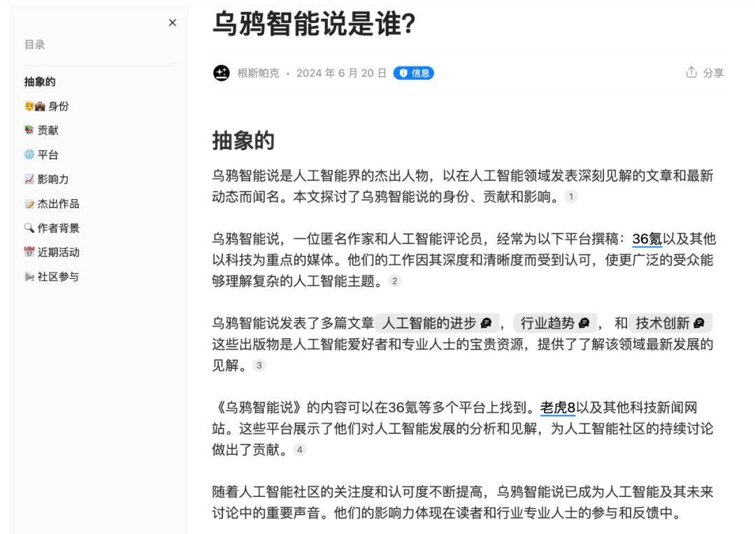 在回答的下方,Genspark還創建了兩個與烏鴉智能説有關的Sparkpage,兩個Sparkpage內容大致相同,包括了基本介紹、發佈平台、關注領域以及代表文章等等。