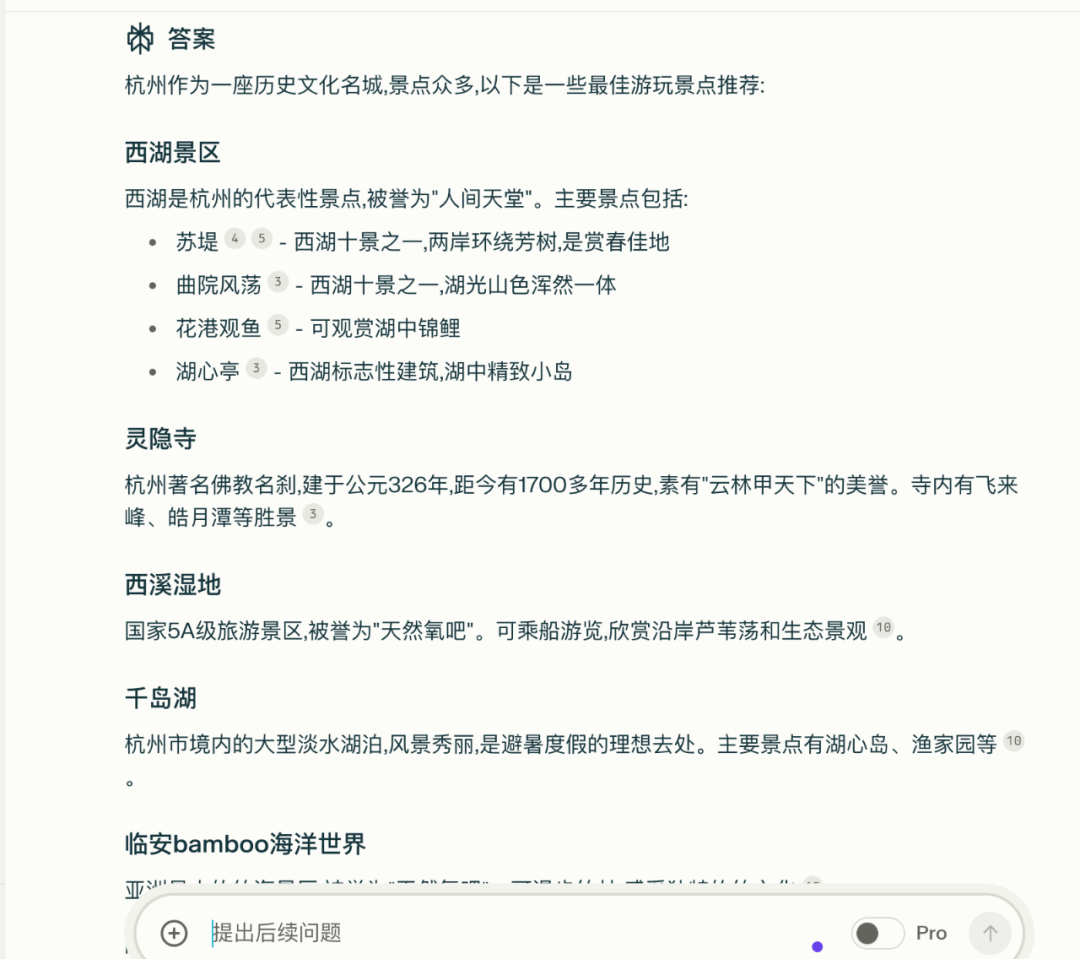 秘塔AI搜索和perplexity給出了差不多的回答,就是大概介紹一些杭州的景點。