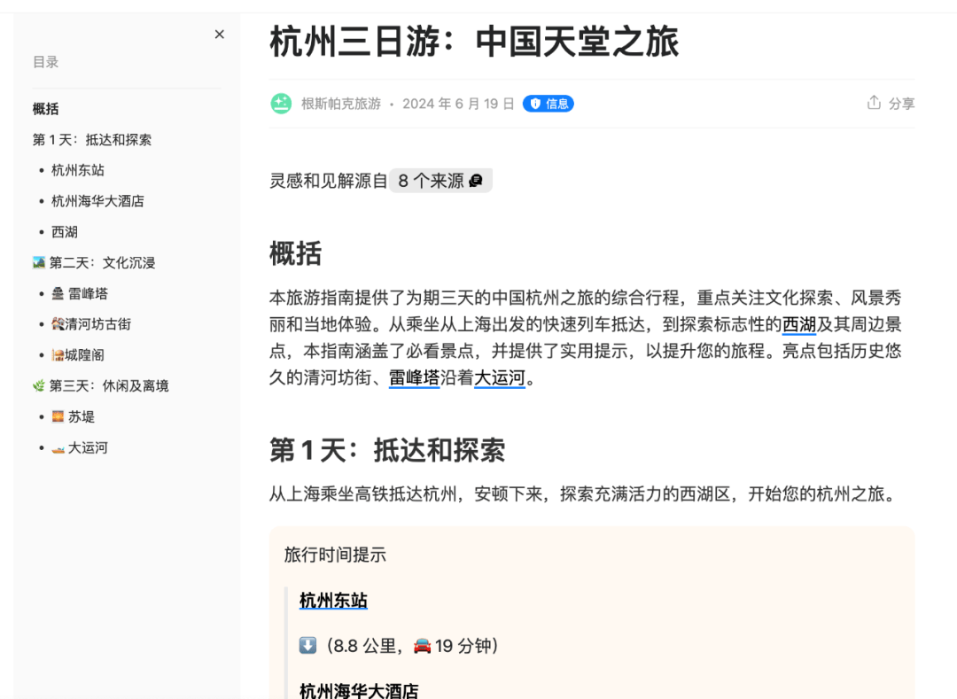從體驗上看,這些總結的內容有點像早期知乎的回答。我放了一個例子,你們感受下。比如,我向秘塔AI搜索、perplexity和Genspark問了同樣一個問題:杭州最佳遊玩景點推薦。