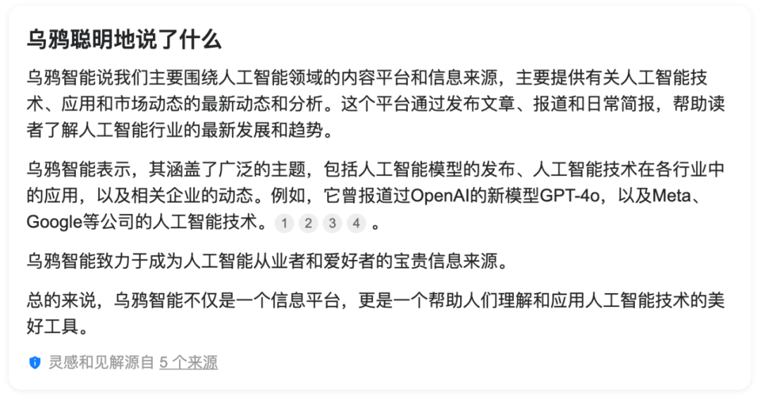 舉個例子,當我向Genspark詢問,“烏鴉智能説是誰?”Genspark會很快給出烏鴉智能説的基本信息,像這樣: