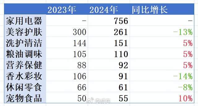 從具體品類來看,今年美容護膚、香水彩妝、休閒零食全面出現負增長。去年只有美容護膚出現了2%左右的下滑,其他品類都在穩增。