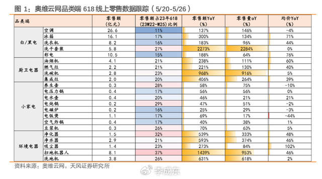 家電缺少同比,我們只找到了首週數據僅供參考,值得注意的是,這份數據遠好於真實情況,因為今年並沒有預售。數據將今年的首周表現和大促還沒有正式開始時期比較,自然會表現更好。