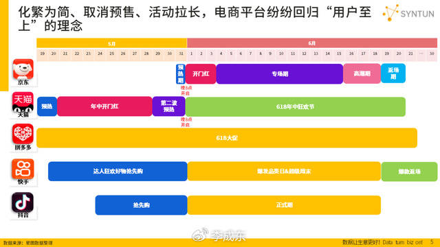雖然取消了預售期,那電商們的現貨開賣時間也基本提前了不少,把整個大促的週期拉得更長。以最早5月19日開始的天貓和拼多多為例,整個大促時期長達一個月。
