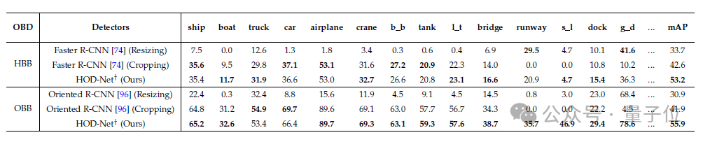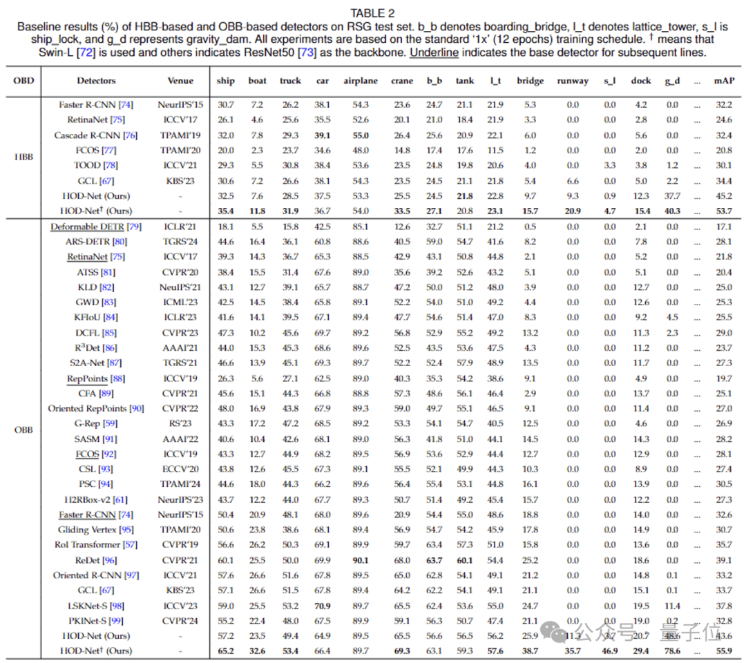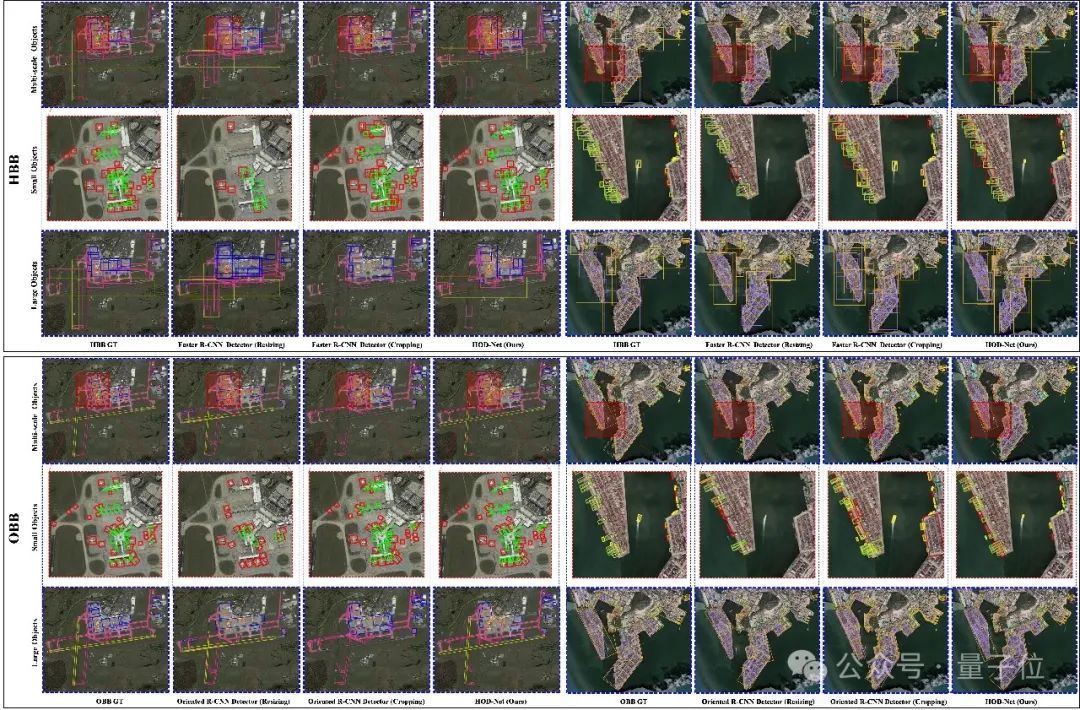 在RSG測試集上的結果表明,在目標檢測任務中,無論是基於水平框(HBB)還是有向框(OBB)的檢測器,團隊提出的HOD-Net框架都取得了總成績和多個單項的SOTA。
