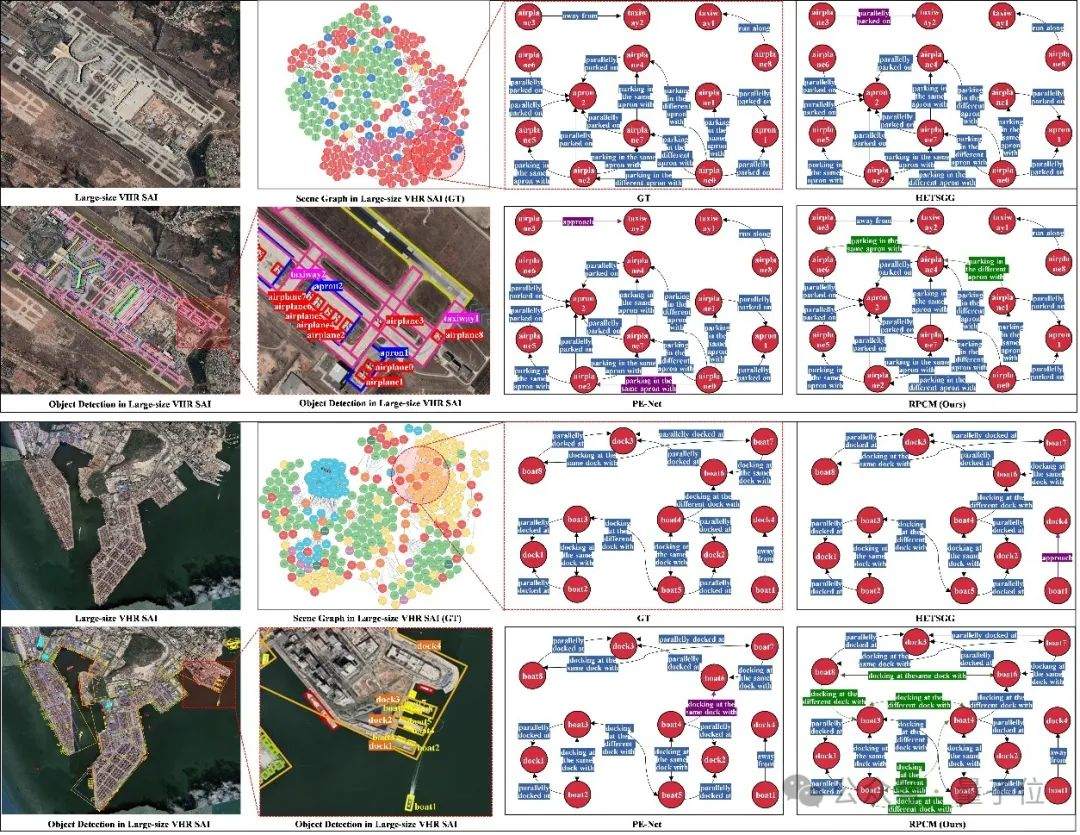 注:下圖是大幅面超高分衞星影像中的SGG示意圖,其中第一行分別展示了大幅面超高分衞星影像的目標檢測和場景圖生成結果,第二行為對應的局部細節展示。在第二行末尾圖中,黑色箭頭表示僅依賴於孤立目標對可預測的關係,而紅色箭頭表示需要藉助上下文推斷的複雜關係。