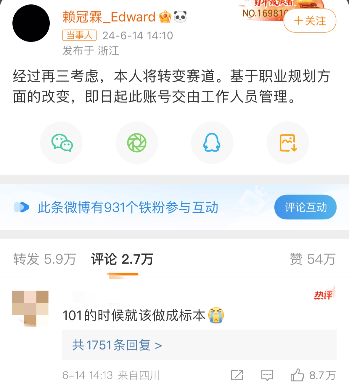 這是賴冠霖發佈“將轉換賽道,賬號交由工作人員管理”的微博後,點贊最多的一條評論。