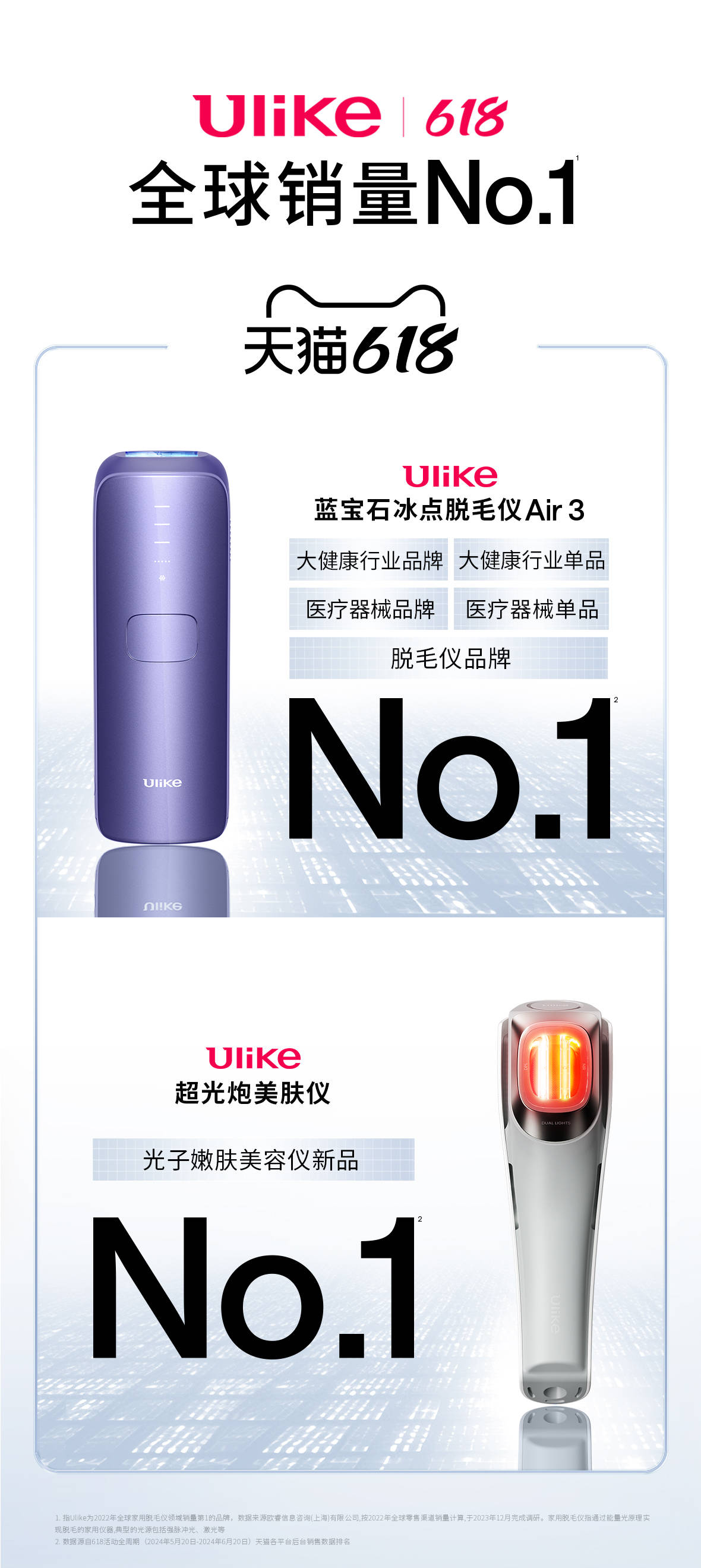 今年618,Ulike在天貓、京東、抖音等平台大健康行業、醫療器械類目、脱毛儀品牌及美容美體品類斬獲多個榜單銷售第1。在天貓平台,Ulike獲得“大健康行業品牌”“大健康行業單品”“醫療器械品牌”“醫療器械單品”“脱毛儀品牌”及“光子嫩膚美容儀新品”六大榜單銷售第1。