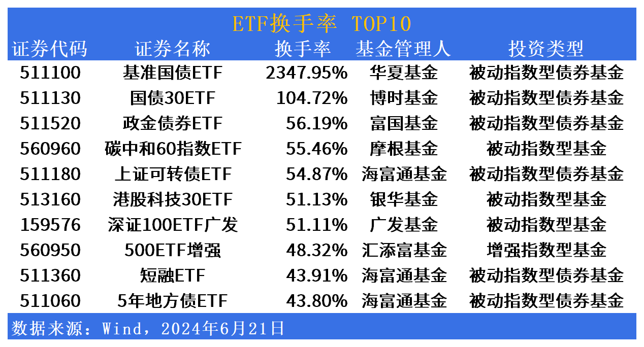 換手率方面,基準國債ETF(511100)仍大幅領先市場,達2347.95%。碳中和60指數ETF(560960)換手率達55.46%,居股票型ETF首位。