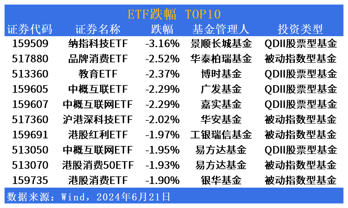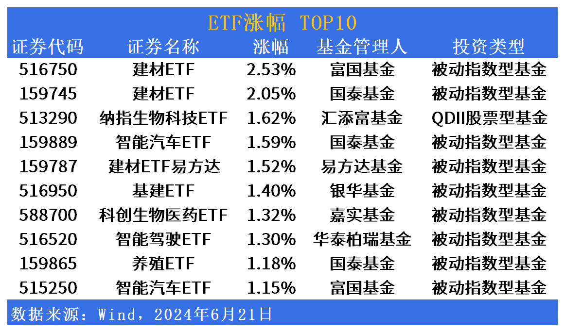 2024年6月21日,Wind數據顯示,上證指數收跌0.24%。水利、基建板塊領漲,新能源車、生物科技概念股活躍;教育、白酒、PEEK材料題材回調。