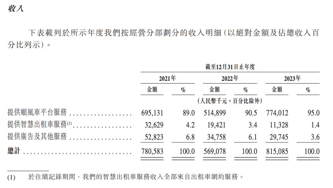 至今順風車平台服務依然是嘀嗒出行主要的營收來源,2023年為其貢獻了95%的營收。