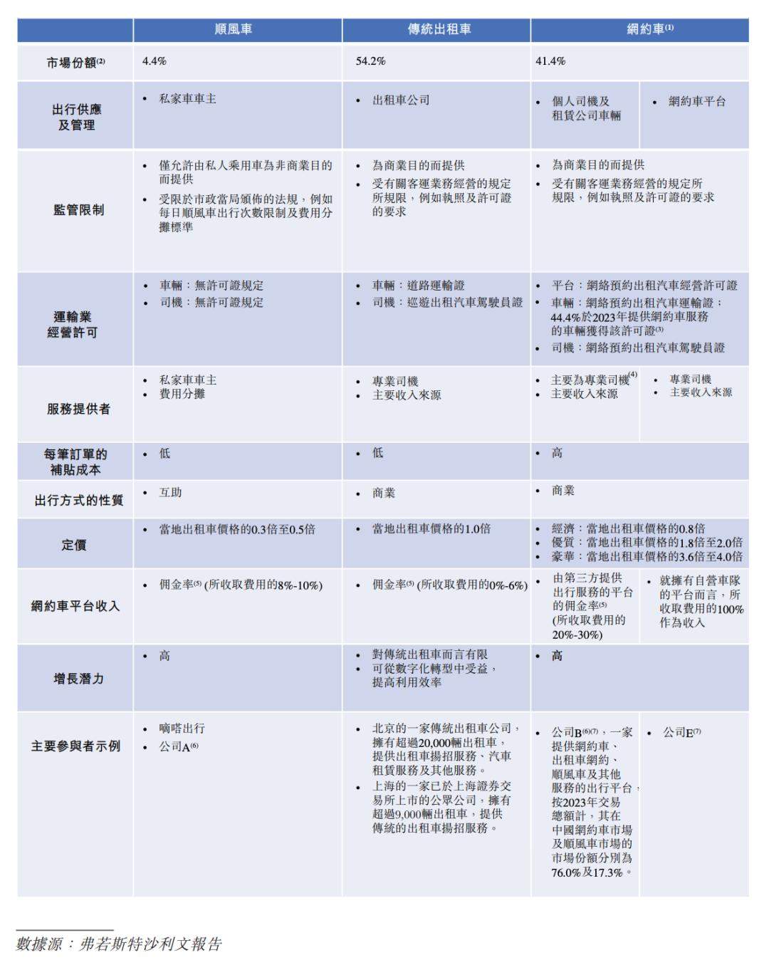 雖然同屬於汽車客運市場,但順風車、網約車、出租車市場規模相差巨大,據弗若斯特沙利文報告,在2023年中國汽車客運交易總額中,順風車、傳統出租車、網約車的市場份額分別為4.4%、54.2%及41.4%。