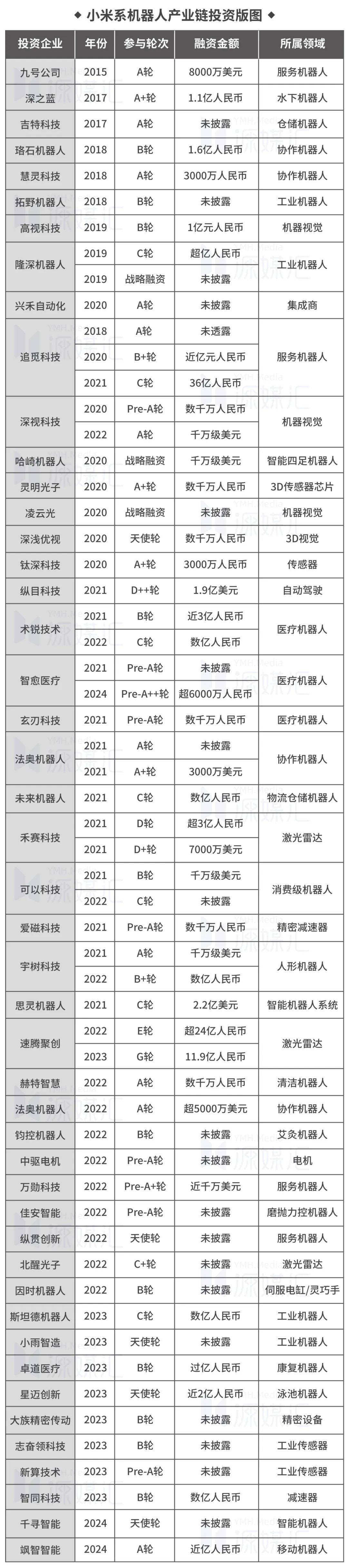 據源媒匯不完全統計,2015年至今,小米在機器人領域共計投資了47家企業,包括九號公司、宇樹科技、追覓科技、斯坦德機器人、法奧機器人、慧靈科技、珞石機器人、凌雲光(688400.SH)、未來機器人、隆深機器人、高視科技、禾賽(NASDAQ:HSAI)以及愛磁科技等,覆蓋機器人核心零部件、系統集成以及本體制造等領域。