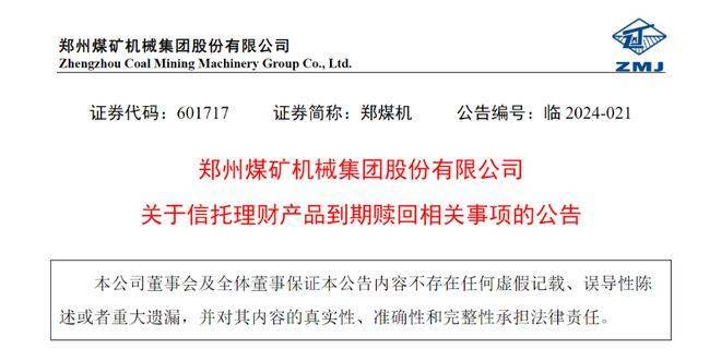 鄭煤機在公告中稱,為合理利用閒置資金,提高資金使用效率,鄭州煤礦機械集團股份有限公司(以下簡稱“公司”)於2023年5月29日與外貿信託簽署了《外貿信託·華軟新動力精選1號單一資金信託合同》、《外貿信託·華軟新動力精選2號單一資金信託合同》、《外貿信託·華軟新動力精選3號單一資金信託合同》,以閒置自有資金30,000萬元向外貿信託認購產品,期限為12個月,預期年化收益率為5.00%。