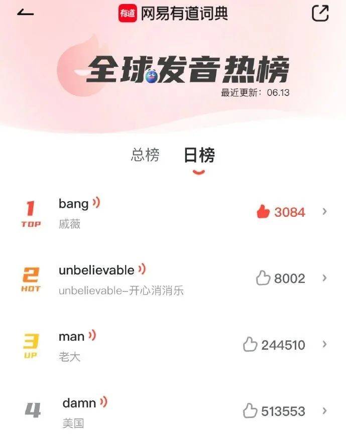 再説“bangbang”,戚薇版的bang已經成為了全球發音熱榜第一。