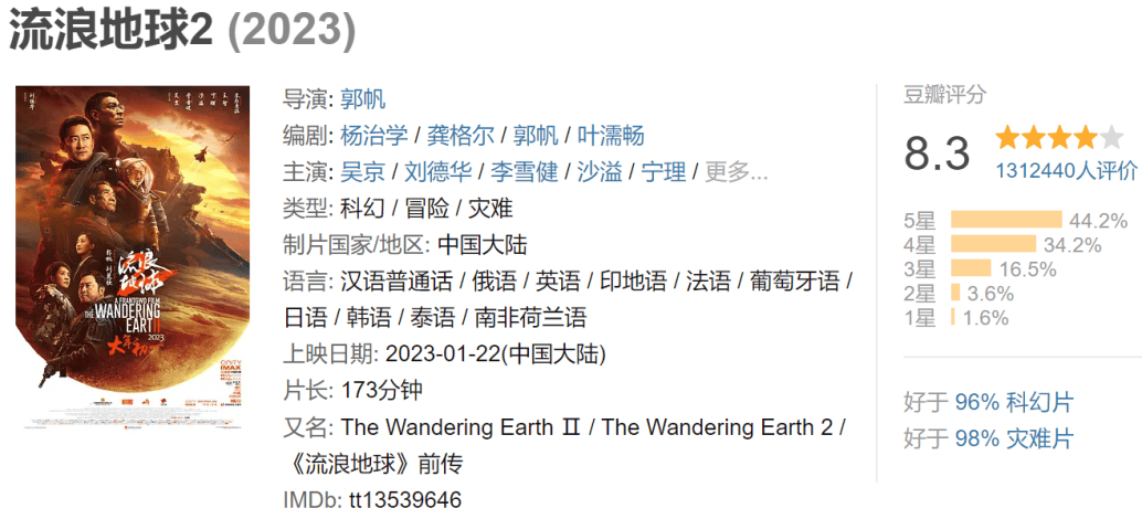 其中,堅持“科創芯、世界窗”異質雙核的松江,2023年引進影視企業1386家,同比增長5.72%,影視企業總量達到7921家。松江還圍繞“產業、技術、人才”三大中心,堅持以科技賦能數字影視產業發展,二集成電路、人工智能等新產業集羣的形成,則為松江打造VR場景、元宇宙虛擬技術等影視技術發展奠定了紮實基礎,助推松江成為最具核心競爭力的科技影都。技術端上,我國電影科技正從跟跑者向並跑者進行蜕變。以電影視效技術為例,青島東方影都影視基地藉助計算機圖形圖像技術等視覺效果技術,承擔了《流浪地球2》等大片的部分特效畫面。該影片上映後,無人機大戰、太空電梯等場景的特效,讓觀眾血脈僨張,被一百多萬豆瓣網友打出8.3的高分,不僅“好於95%科幻片,好於98%災難片”,“不必對比什麼,作為里程碑他已無敵”的短評還被點了四萬多“有用”。