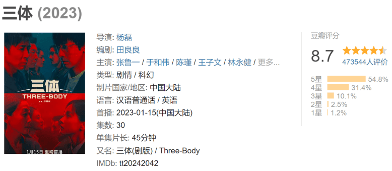 如果是科幻小説迷,相信看到以上簡介就會會心一笑,即使不是,該劇也可以吸引很多觀眾的注意,原因只有一個:**《夢之海》改編自劉慈欣所著的同名小説。**作為國產科幻小説的執牛耳者,劉慈欣所著的《三體》系列以天馬行空的想象和對人類命運深切思考聞名世界,獲得過雨果獎、軌跡獎、星河獎等多個科幻小説大獎。而他本人的作品也是國產科幻影視作品改編的一座富礦,《流浪地球》《流浪地球2》《瘋狂的外星人》,不僅質量上乘,票房也十分亮眼。楊磊執導,張魯一、於和偉、陳瑾等演員主演的《三體》則在豆瓣獲得了8.7的高分,贏得了原著書粉和觀眾的一致稱讚。