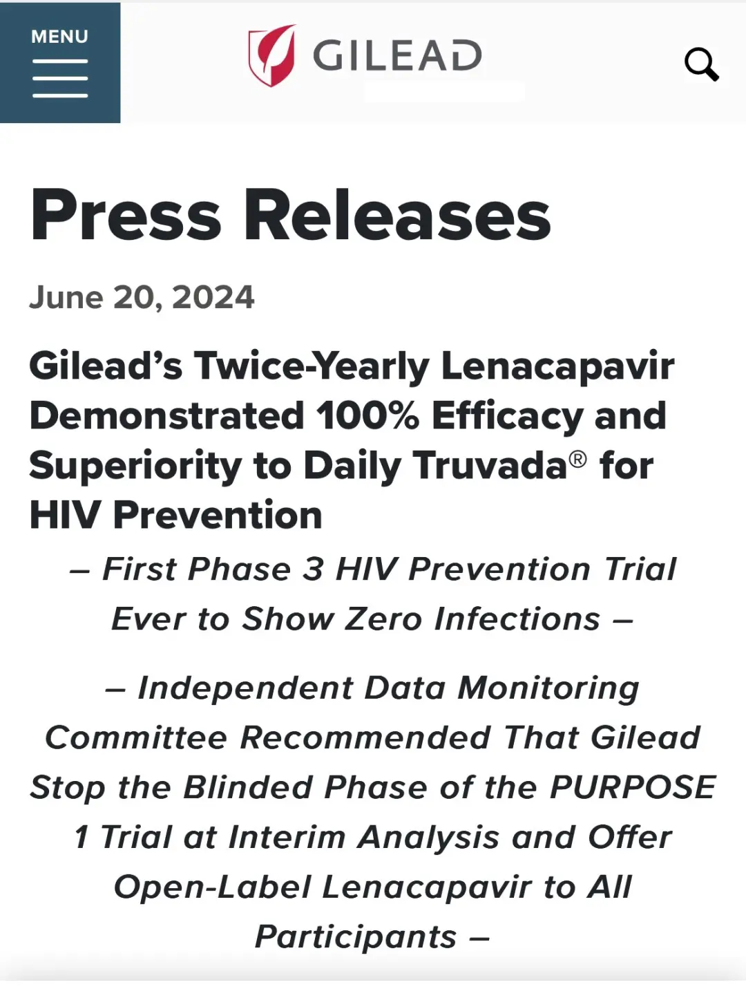 6月20日,美國生物製藥公司吉利德在其官網發佈了一則重磅實驗結果,其研發的艾滋預防新藥“Lenacapavir”(來那卡帕韋),在預防年輕女性HIV感染試驗中顯示出100%的有效率。