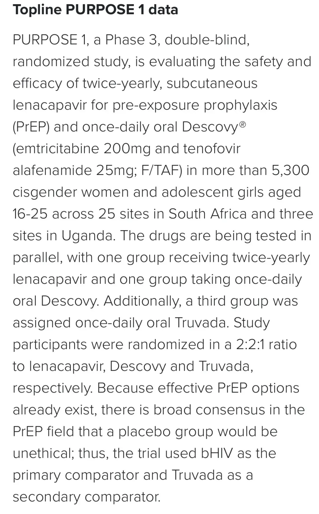 目前PURPOSE 1是中期數據分析,最終結果還需要更長時間的分析。但由於目前展示出來的出色有效性,獨立數據監測委員會已經建議吉利德停止雙盲法(臨牀對照),向所有參加臨牀試驗的女性志願者提供Lenacapavir。