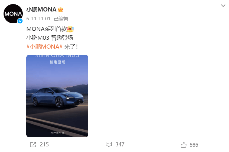 然後小鵬官方就説了, MONA 成了一個新的系列,而不是新品牌。
