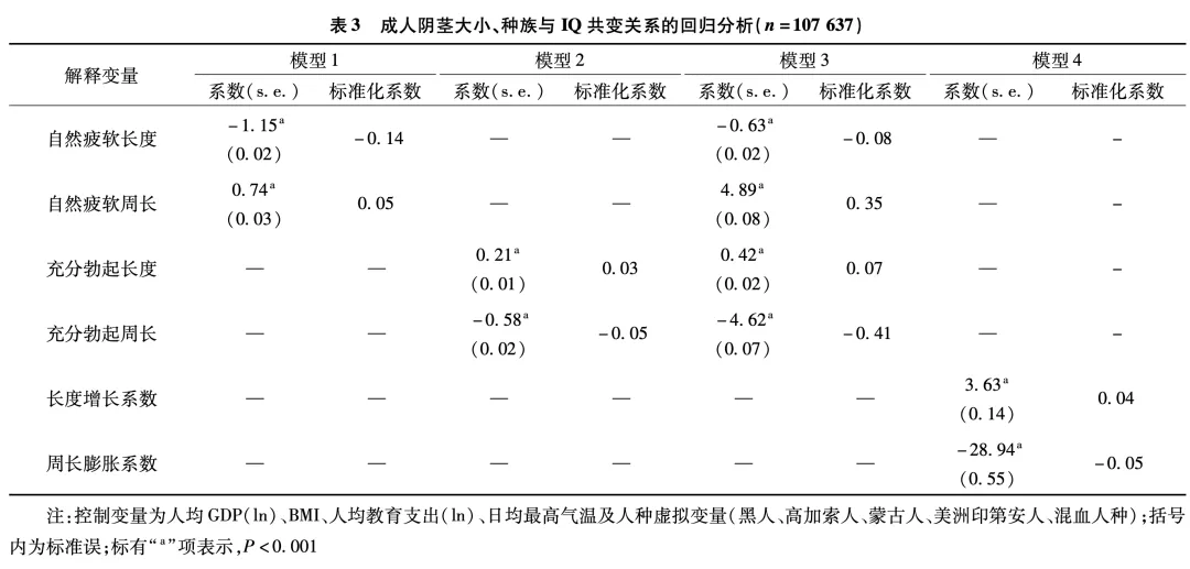 表3報告了在控制人均GDP(ln)、BMI、人均教育支出(ln)、日均最高氣温及種族等變量的條件下,以IQ為結果變量,模型1、模型2與模型3分別報告了成人陰莖的自然疲軟長度及周長、充分勃起長度及周長的迴歸係數、標準化迴歸係數,描述了IQ與陰莖大小之間的共變關係。結果顯示,在控制其他變量的條件下,成人陰莖的自然疲軟長度與IQ呈現明顯的負相關(P<0.001)。同時,進行了不同種族間的IQ比較,發現其差異具有統計學意義(P<0.001)。基於此,進行標準化係數的比較,並分別引入陰莖的長度增長係數、周長膨脹係數等作為新迴歸模型的關鍵變量(模型4),以對上述迴歸結果進行穩健性檢驗。結果發現,穩健性檢驗的結果與迴歸結果趨同。