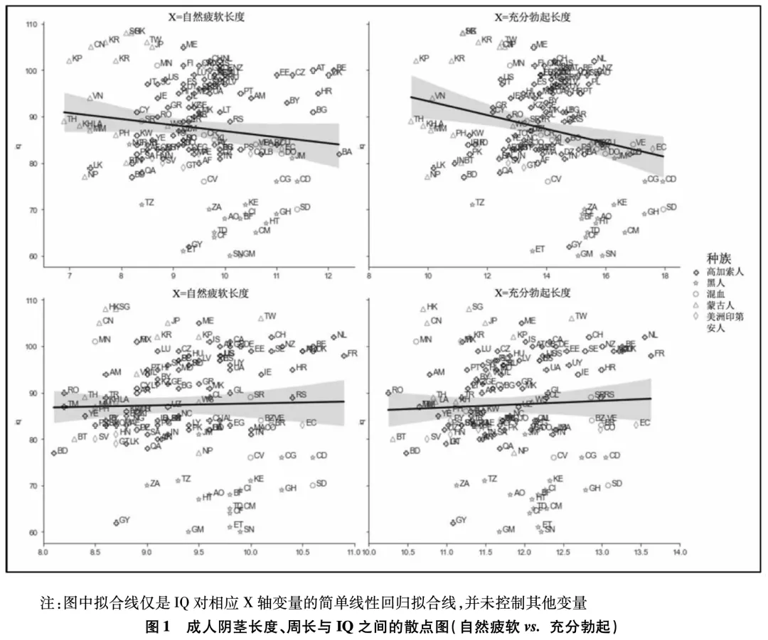 在自然疲軟狀態下,當控制陰莖的周長不變時,陰莖的長度與IQ呈現負相關(P<0.001),即陰莖的長度越短,對應個體的IQ就越高,並表現出顯著的種族差異。當控制自然疲軟周長、充分勃起長度與周長時,結論也是如此。