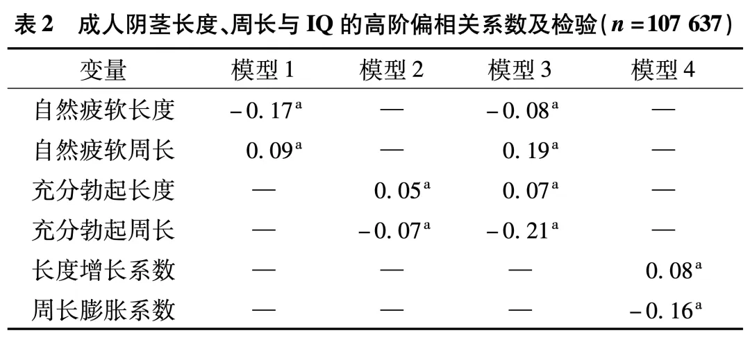 表2分別報告了在控制人均GDP(ln)、BMI、人均教育支出 (ln)、日均最高氣温及種族等變量的條件下,成人陰莖的自然疲軟長度及周長、充分勃起長度及周長、長度增長係數、周長膨脹係數與IQ之間的高階偏相關係數及統計檢驗結果。其中,模型1報告了陰莖自然疲軟長度、周長與IQ的高階偏相關係數;模型2報告了陰莖充分勃起長度、周長與IQ的高階偏相關係數;模型3報告了在控制陰莖充分勃起長度、周長時,陰莖自然疲軟長度、周長與IQ的高階偏相關係數;模型4報告了陰莖的長度增長係數、周長膨脹係數與IQ的高階偏相關係數。結果顯示,在控制其他變量的條件下,成人陰莖的自然疲軟長度與IQ之間呈現明顯的負相關關係(P<0.001)。