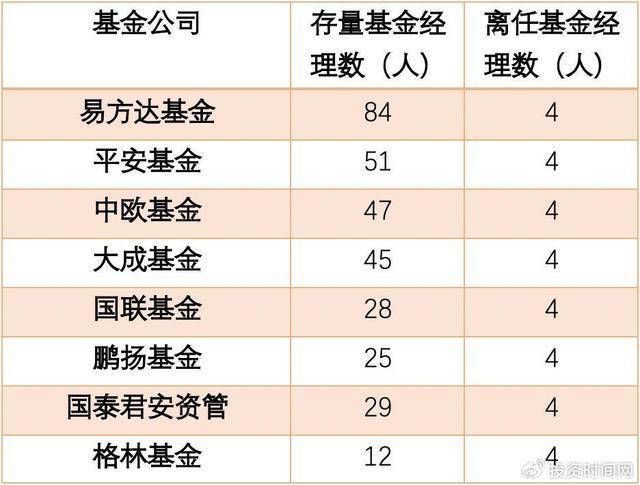 今年以來,有四位基金經理離任的基金管理機構為八家,包括易方達基金、平安基金、中歐基金、大成基金、國聯基金、鵬揚基金、國泰君安資管、格林基金,大中小型基金管理機構均現身。