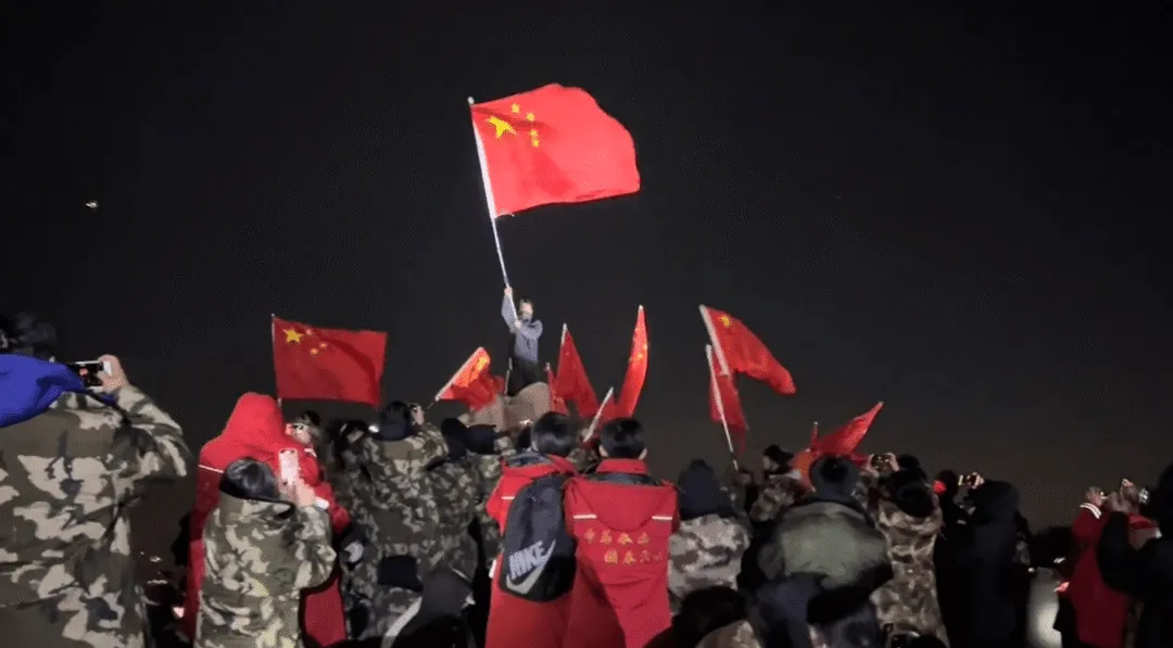 ● 2023年10月1日凌晨,遊客帶國旗夜爬泰山並集體高唱國歌。圖片來源:九派新聞