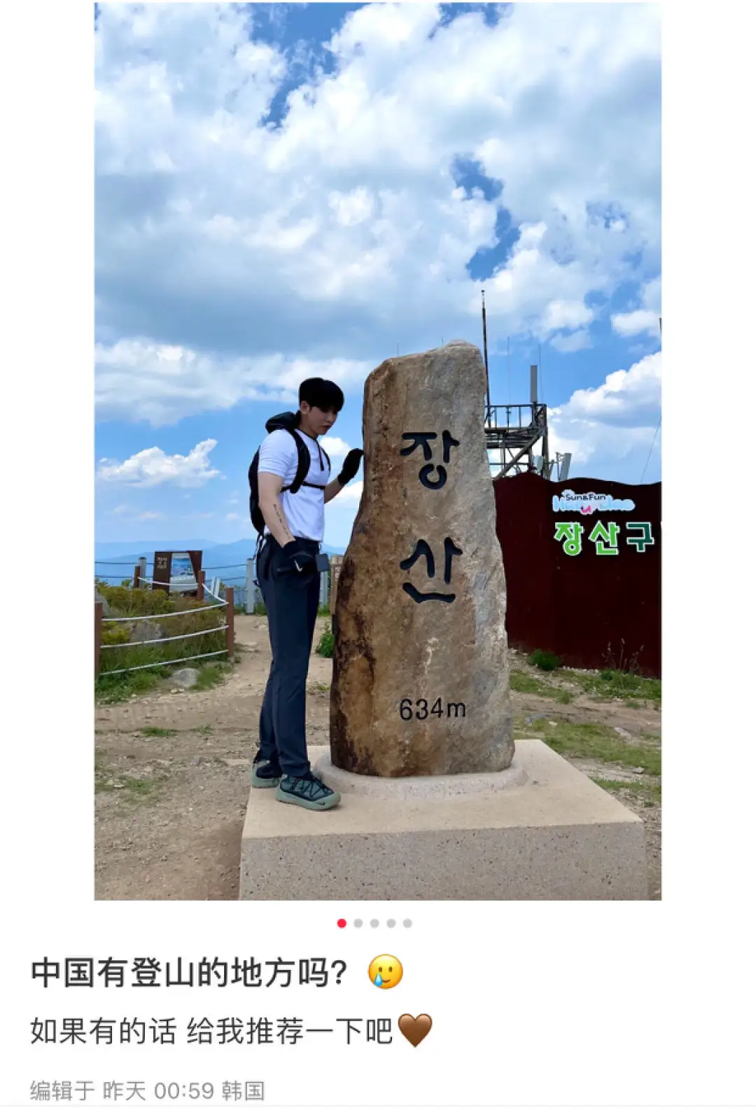 前幾天,有位韓國朋友全副武裝,艱難且頑強地戰勝了韓國最難爬的、海拔高達634米的山。