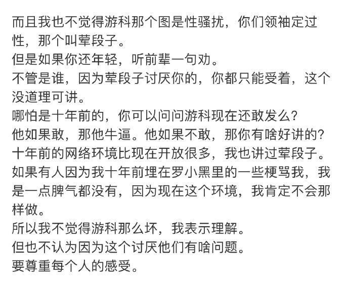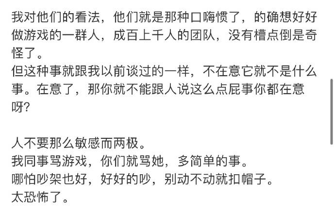 我依然還是那個觀點,我知道自己有很多這種發言,久遠的葷段子可以理解,因為那些葷段子討厭我的,並沒有問題,我的確只能受着,(那些圖裏都帶着朋友的id和形象,就不發了,大部分是基友,不好意思連累你們了)當年的氛圍就是這樣~我也是在為他們解釋時直説過(圖一)。基本把各個原因解釋進去了,包括女玩家誤會的事(圖四),我私下也跟她們解釋了。中間的一連串問題,我覺得都是可以説明的,是真的希望能彙總一篇解釋讓這些爭論結束(圖八),並不是引戰。想着自己一篇文章能不能互相理解,但可能的確想當然了,幼稚的是自己,現在看,冷處理也許的確是最好的處理,我的確不應該那樣讓他們表態。最後拿作品説話的確是最優解。當然,最後對一直讓我表態一直刷評的人的確陰陽怪氣了,因為我已經被衝了一週了。我也依然不覺得這樣是對的。