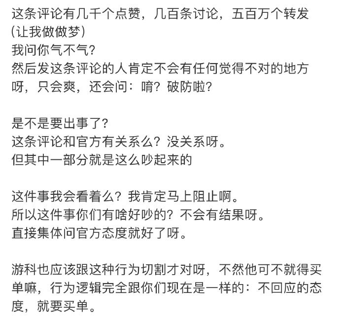 簡單表態阻止她其實就可以解決,但因為我也是這個遊戲的玩家,我想着能不能解釋下來龍去脈。這樣解釋對我半點好處都沒,看我發博的頻率也能知道我並不是喜歡湊熱鬧博關注的人,只是以為會有用,還是高看自己了。