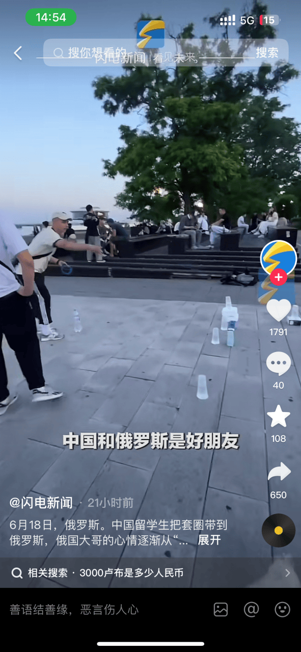 視頻中,中國留學生在俄羅斯擺攤套圈,第一天試營業便吸引了不少人圍觀,一小時收入3000盧布(約為人民幣249元)。