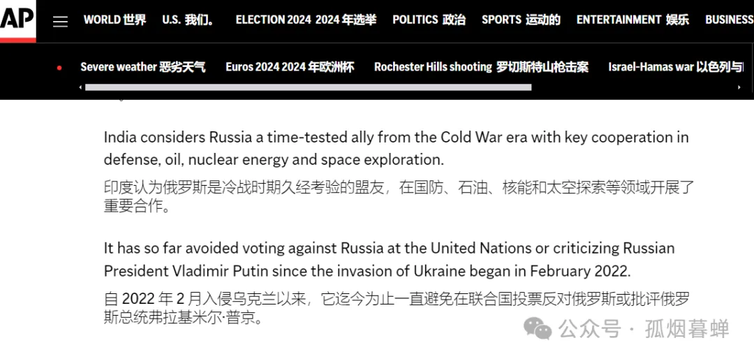 “印度自始至終都認為,俄羅斯自冷戰以來就是印度久經考驗的盟友,雙方在國防、石油、核能和航天等領域均有密切合作。自 2022 年 2 月的俄烏衝突爆發以來,印度一直避免在聯合國投票反對俄羅斯,亦或是公開發表任何有可能觸怒普京的言論。”