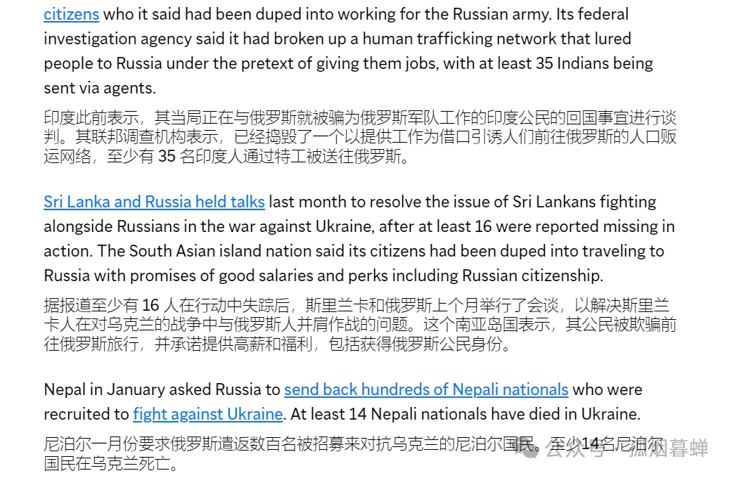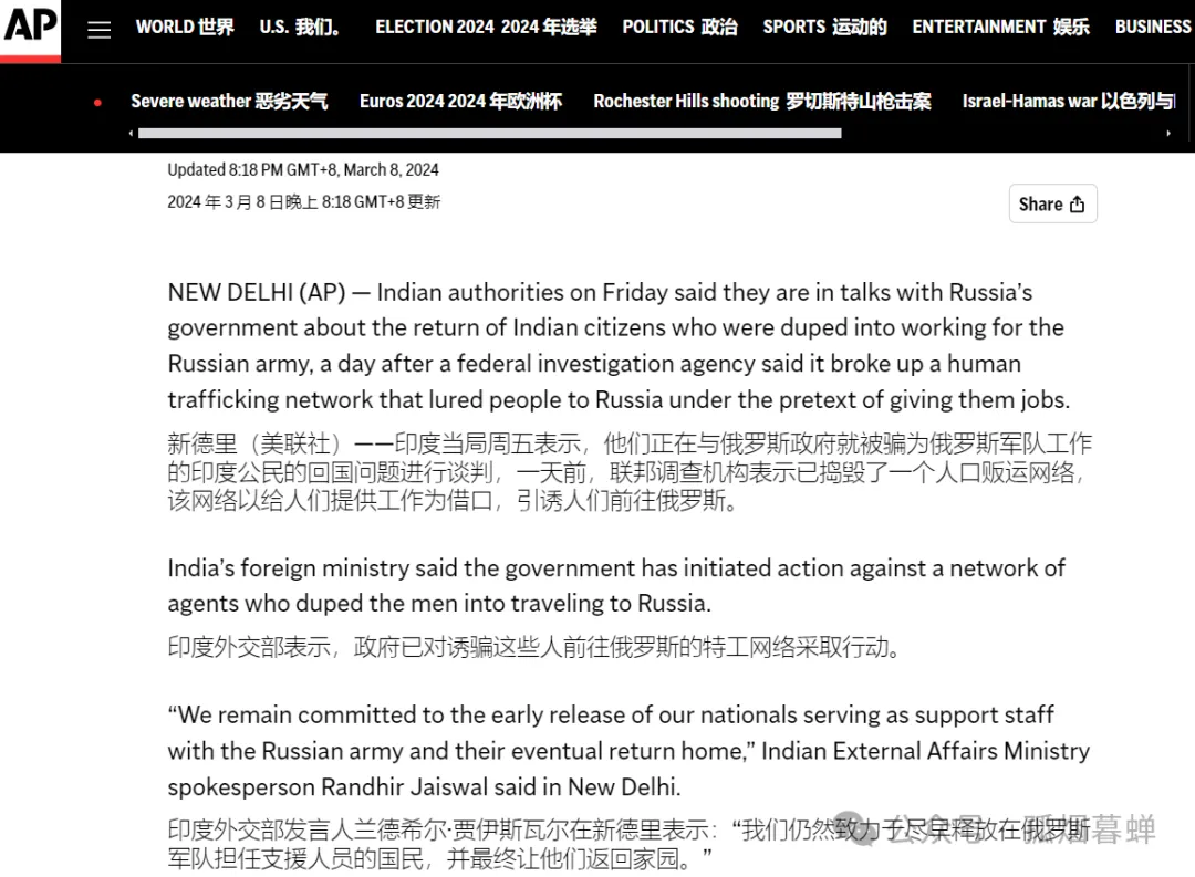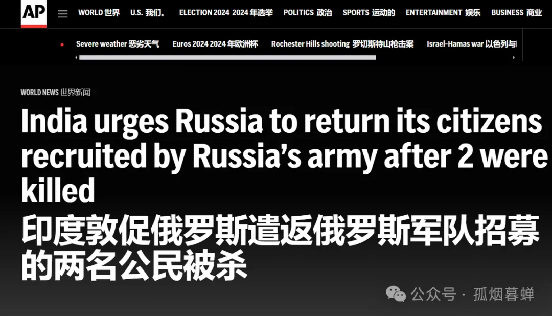 不僅是我,美聯社也一樣,他們報道他們的,完了俄羅斯這邊該招募印度公民去填線還是會招募,印度那邊該譴責俄羅斯的背地算計還是會譴責,自甘接受俄方開出的條件去烏克蘭賣命的印度人還是會賣命。